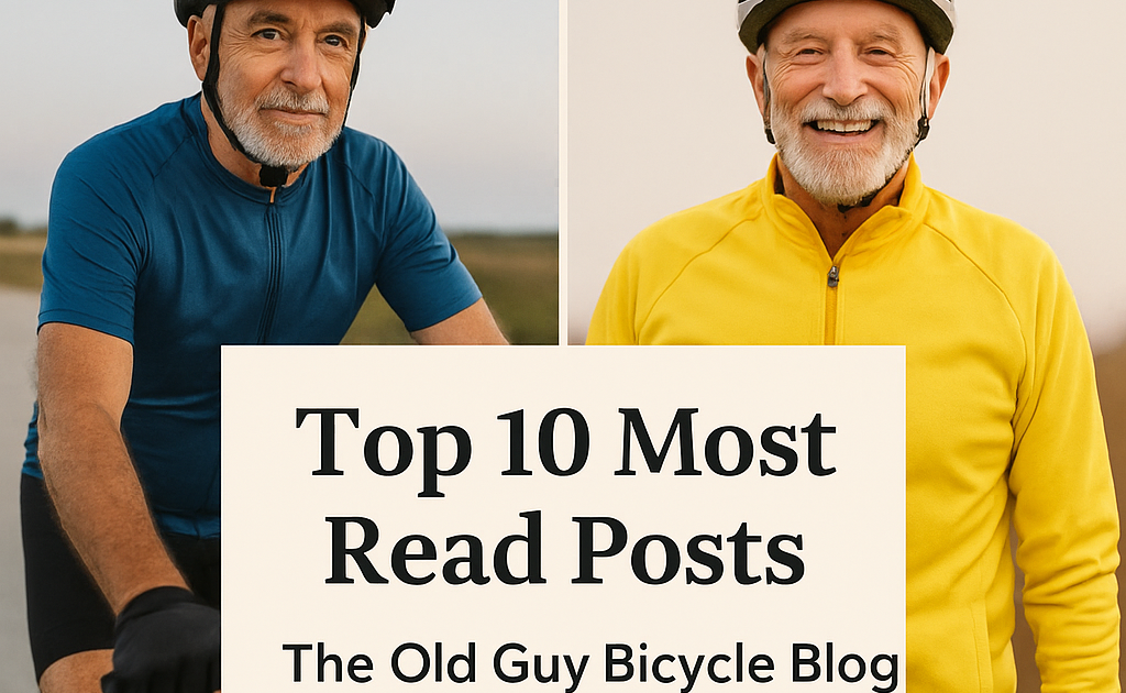 collage of senior cyclists riding on scenic roads and smiling, symbolizing popular articles from The Old Guy Bicycle Blog